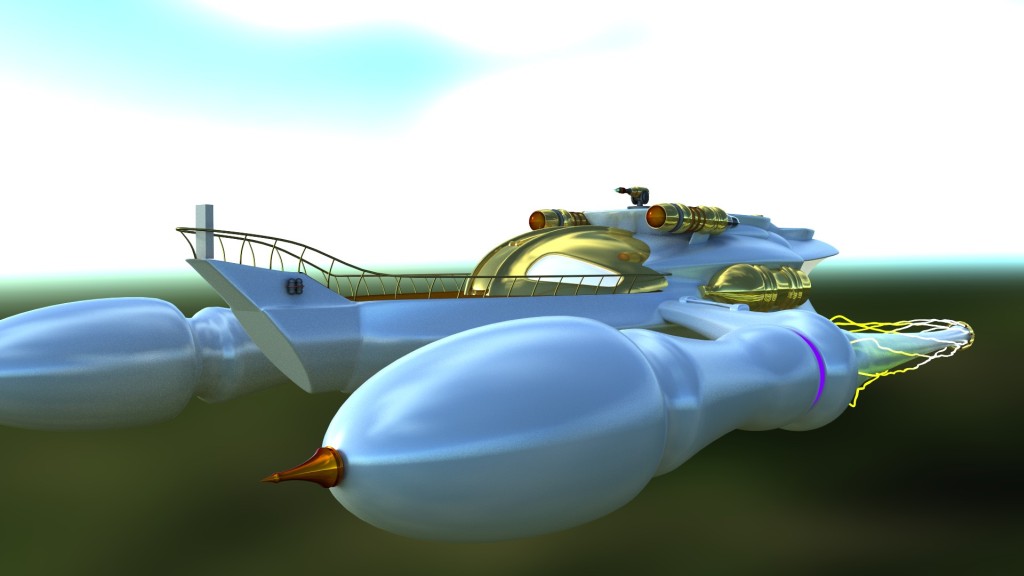This particular vessel is a small transport suitable for an adventuring party. It is armed with a light etheric weapon, and propelled by etheric screws (the green spiraling energy beams). The box standing on the deck at the nose is roughly the size of a human.